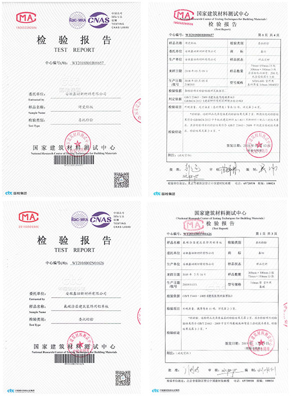 烤瓷鋁板的性能通過國家建筑材料質量監督檢驗中心檢測,按國家標準GB/T23443-2009《建筑裝飾用鋁單板》的標淮得出的數據,所有的指標都是合格,特別其硬度達到6H以上。防火性能通過國家防火建筑材料質量監督檢驗中心檢測,按國家標準BB/T8624-2006《建筑材料及制品燃燒性能分級》的標準得出數據,其防火性能A1級。