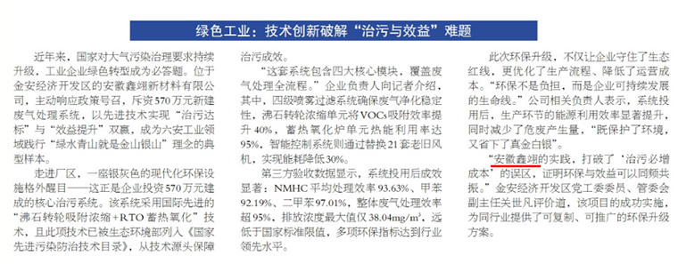 在報道中,金安經濟開發區黨工委委員、管委會副主任關世凡評價道:“該項目的成功實施,為同行業提供了可復制、可推廣的環保升級方案。”這一評價不僅充分肯定了安徽鑫翊在綠色轉型中的成果,也意味著企業的發展模式得到了主管部門與權威媒體的高度認可。